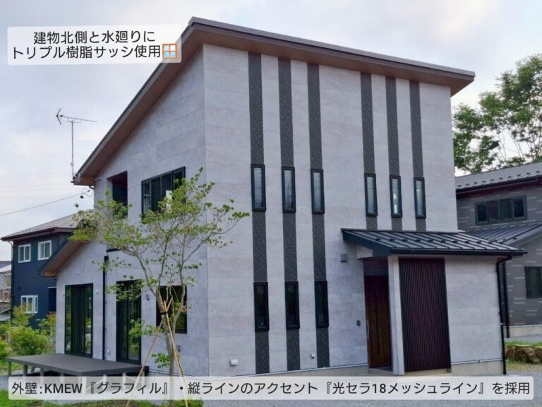 ・外壁には #KMEWの #グラフィル と縦ラインのアクセントに #光セラ18メッシュライン を採用